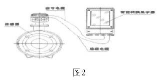 化工污水管道流量計(jì)是由流量傳感器和轉(zhuǎn)換器(也叫顯示器)兩大部分組成。測(cè)量管上下裝有激磁線圈,通激磁電流后產(chǎn)生磁場(chǎng)穿過(guò)測(cè)量管,一對(duì)電極裝在測(cè)量管內(nèi)壁與液體相接觸,引出感應(yīng)電勢(shì),送到轉(zhuǎn)換器。激磁電流則由轉(zhuǎn)換器提供。如圖2所示: