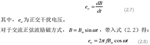 從上圖 2.5 中可以觀察到兩個(gè)電極、勵(lì)磁線圈、轉(zhuǎn)換器內(nèi)阻之間形成了一個(gè)閉合回路,將此回路稱(chēng)之為初級(jí)繞組,從理論上進(jìn)行分析,磁力線 B 應(yīng)當(dāng)平行于勵(lì)磁線圈所產(chǎn)生的磁感應(yīng)線,但在實(shí)際的應(yīng)用過(guò)程中由于工藝差異,因此無(wú)法達(dá)到理想狀態(tài),會(huì)產(chǎn)生磁力線穿過(guò)勵(lì)磁線圈磁感應(yīng)線的情況,此時(shí)將會(huì)產(chǎn)生相應(yīng)的感應(yīng)電動(dòng)勢(shì),將此部分感應(yīng)電動(dòng)勢(shì)稱(chēng)為變壓器效應(yīng)。此效應(yīng)同樣滿足于楞次定律,利用楞次定律進(jìn)行計(jì)算可得如下電動(dòng)勢(shì):