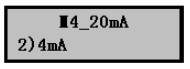 在20mA參數(shù)設(shè)置菜單按擊▼鍵進(jìn)入4mA參數(shù)設(shè)置菜單,按擊OK鍵進(jìn)入設(shè)置,方法同上。