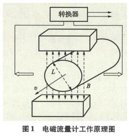 污水處理廠(chǎng)流量計(jì)是利用法拉*電磁感應(yīng)定律測(cè)量,如圖1所示,用于測(cè)量電極與運(yùn)動(dòng)的流體構(gòu)成的回路中產(chǎn)生的電參數(shù),并根據(jù)公式換算成流體速度,再測(cè)量流通截面液位高度得到流通面積,兩者相乘得到所測(cè)流量。