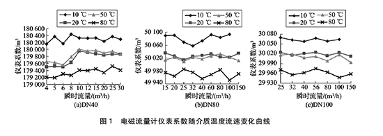 將實(shí)驗(yàn)測得的給排水流量計(jì)在不同溫度及流速下的儀表系數(shù)數(shù)據(jù)整理,特性曲線如圖1所示,3組曲線分別對應(yīng)DN40, DN80, DN100的3塊給排水流量計(jì)的儀表系數(shù)曲線。