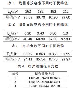 仿真試驗(yàn)中,設(shè)定線圈等效電感取值范圍為 162~212mH,間隔 10mH;閉合回路等效電感范圍 0.2~1mH,間隔為 0.2mH;雙電層電容、接觸電阻隨流體電導(dǎo)率變化而變化,電導(dǎo)率增大接觸電阻和雙電層電容減小而電荷傳遞電阻增大。可設(shè)定電極接觸電阻、雙電層電容和電荷傳遞電阻范圍分別為 5~15kΩ、10~20μF 和50~60Ω,由公式(7)知,可用 T2 表示上述三者關(guān)系。 仿真參數(shù)取值不同情況下,通過 MATLAB 工具箱對仿真測量得到的干擾峰值進(jìn)行曲線擬合畫出相應(yīng)的曲線圖。 其中仿真數(shù)據(jù)和相對應(yīng)的曲線方程如表 1~表 4 所示,曲線圖如圖 4~圖 6。