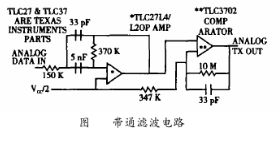 HART數(shù)字信號規(guī)范是峰值為1mA、平均值為0mA正弦交流電流信號,此信號經(jīng)線路阻抗轉化為正弦交流電壓信號,而HT2012輸入和輸出信號是0~5V的方波信號,因此在HT2012和外部的HART信號之間還需要有濾波電路和整形電路。如圖3所示,由TLC27組成的濾波器是帶通濾波器,用來減少接收信號的噪聲干擾。濾波器還用來消除波形中的尖峰,從而使接收到的信號變得平緩。TLC37組成的數(shù)字方波產(chǎn)生回路把經(jīng)過TLC27濾波后的正弦波轉變成相應的方波,以便于HT2012接收。