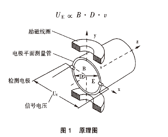 產(chǎn)生與流量成比例的感應(yīng)電勢,流體中產(chǎn)生的感應(yīng)電動勢被位于管子徑向兩端的一對電極拾取,該信號電壓uE與磁場強(qiáng)度B、電極間距離D和平均流速穢成正比。磁場強(qiáng)度B和電極距離D是常數(shù),所以信號電壓與平均流速口成正比。計(jì)算公式如下: