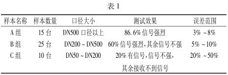 通過大量的在線檢測試驗,可以看出所測管道管徑對超聲流量計測試效果有明顯影響。根據(jù)數(shù)據(jù)顯示,管徑越大,測試效果越好,示值誤差越小。隨著管徑的減小,超聲流量計所能檢測到的流速信號也隨著變?nèi)酰?dāng)口徑小于 DN50 時,基本沒有信號或是產(chǎn)生巨大的干擾信號。