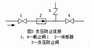 氟塑料襯里傳感器須謹慎地應用于負壓管系;正壓管系應防止產(chǎn)生負壓,例如液體溫度高于室溫的管系,關閉傳感器上下游截止閥停止運行后,流體冷卻收縮會形成負壓,應在傳感器附近裝負壓防止閥,如圖3所示。有制造廠規(guī)定PTFE 和PFA 塑料襯里應用于負壓管系的壓力可在200C、1000C、1300C時使用的絕對壓力必須分別大于27、40、50KPa。
