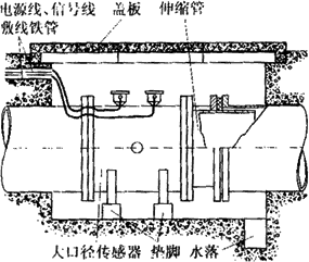 由于大口徑管道在多數(shù)場合下是埋在地下的,因此大口徑傳感器在安裝前應做好水泥地坑。圖6-19所示是在給排水系統(tǒng)中常見的安裝形式。水泥地坑應有足夠的活動空間,側壁埋有敷設電纜的鋼管,上有蓋板防止雨淋,下有泄水管以免坑內積水而使傳感器侵水。為了拆裝方便,傳感器應放在墊腳上,且在下游側裝有活絡的伸縮管。圖6-20是熱水流量計在地下水泥管污水排放系統(tǒng)中的安裝實例。