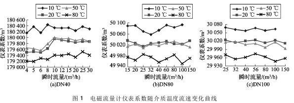 將實(shí)驗(yàn)測得的dn150深井水流量計(jì)在不同溫度及流速下的儀表系數(shù)數(shù)據(jù)整理,特性曲線如圖1所示,3組曲線分別對應(yīng)DN40、DN80、DN100的3塊dn150深井水流量計(jì)的儀表系數(shù)曲線。