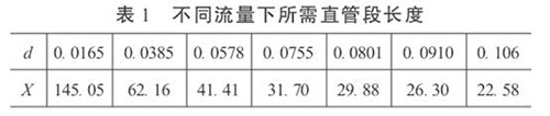 3.直管段長度和硅油流量計精度的初步預(yù)測在工程設(shè)計中,根據(jù)流體性質(zhì)、流量和雷諾數(shù)確定α和d值。這樣,按照式(5)就可以依不同的流量計精度要求,對直管段長度進行初步預(yù)測,或確定直管段長度后,對流量計的精度做初步預(yù)測。當(dāng)δ= 0.2%時,不同流量下所需直管段長度見表1。