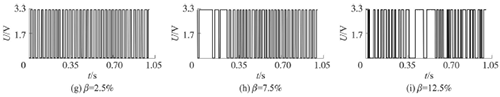 試驗發(fā)現(xiàn),氣相的加入對乙烯流量計測量的影響顯著,譜分析和脈沖計數(shù)兩種方法隨著氣相注入的增加其表現(xiàn)也不同。圖4反映了水流量12m3/h時,注入不同氣含率β時A點的模擬信號,如圖4(a~c)所示;經(jīng)譜分析后得到的頻率值,如圖4(d~f)所示;用脈沖計數(shù)方法得到的脈沖信號,如圖4(g~i)所示。圖4顯示,當注入氣量不大時,對乙烯流量計的影響不大,無論是譜分析結(jié)果還是脈沖計數(shù)得到的結(jié)果都比較好。當注入的氣量進一步增加時,渦街原始信號強度和穩(wěn)定性逐漸變差,渦街頻率信號會被干擾信號所淹沒,反映到譜分析圖是,渦街頻率的譜能量減小,干擾信號的譜能量加強;對于脈沖信號,會因為一些旋渦信號減弱,形成脈沖缺失現(xiàn)象,而不能真實地反映渦街產(chǎn)生的頻率。
