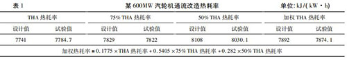 隨著火電機組利用小時數(shù)降低,發(fā)電企業(yè)一般都會根據(jù)不同負荷工況下的實際運行小時數(shù),確定機組熱耗率考核權(quán)重,形成*終的加權(quán)熱耗率考核值??己思訖?quán)熱耗率對設(shè)備廠家末級葉片選型、高壓調(diào)門與高壓缸匹配性提出了更高的要求,在當前負荷率偏低的情況下增強了發(fā)電企業(yè)的競爭力。然而,僅僅對加權(quán)熱耗率進行考核是不夠的,設(shè)備廠家為了增強自身的競爭力,往往會把全部重點放在如何降低占比大的低負荷熱耗率上而犧牲高負荷的熱耗率,這無疑削弱了發(fā)電企業(yè)的適應性。某廠一臺 600MW 汽輪機通流改造時僅對加權(quán)熱耗率進行考核,THA 熱耗率要高出設(shè)計值43. 7 kJ/( kW·h) ,詳見表 1。通流改造時既要對加權(quán)熱耗率進行考核,也要對 THA工況時熱耗率進行考核。