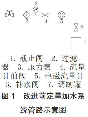 工廠的香料廚房系統(tǒng)為國內(nèi)煙機(jī)公司 2004 年設(shè)計(jì)制造,其定量加水系統(tǒng)主要由水源、生活污水流量計(jì)、加水管路元件和控制程序這四部分組成,改進(jìn)前管路示意圖如圖 1 所示。