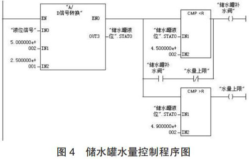 (2)程序設(shè)計(jì)。儲(chǔ)水罐水量控制的工作過程為:當(dāng)壓力變送器檢測到儲(chǔ)水罐的水量低于 450kg 時(shí),補(bǔ)水閥 3 開啟為儲(chǔ)水罐補(bǔ)水;當(dāng)水量達(dá)到 490kg 時(shí),補(bǔ)水閥 3 關(guān)閉;生產(chǎn)配制過程中,循環(huán)以上控制過程。儲(chǔ)水罐水量控制的程序如圖 4 所示。
