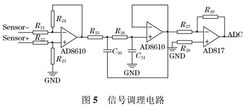 如圖4 所示,信號調(diào)理電路由前置放大電路、濾波電路以及二次放大電路組成。其中前置放大電路主要是由 AD8610 組成的差分放大電路構(gòu)成,其主要是去除信號中的共模干擾并且進(jìn)行*一次前置放大,前置放大電路的放大倍數(shù)為 15。由于有效信號的幅值很小,經(jīng)過前置放大電路后信號中還存在很多高頻雜波,這些雜波會影響對后級信號的處理,因此還需要對前置放大電路輸出的信號進(jìn)行低通濾波和二次放大。系統(tǒng)選用二階有源低通濾波電路濾除信號中的高頻干擾,低通濾波的截止頻率設(shè)定在 6 kHz 左右,選用 AD817 組成的二次放大電路對濾波電路輸出的信號進(jìn)行二次放大,將信號調(diào)理電路輸出的信號調(diào)整在 0~5 V 之間,*終利用 DSP 內(nèi)部的 AD 轉(zhuǎn)換器對此信號進(jìn)行模數(shù)轉(zhuǎn)換得出傳感器線圈輸出的感應(yīng)電動勢,從而根據(jù)相關(guān)的公式計算得出管道中液體的流量。具體電路圖如圖 5 所示。
