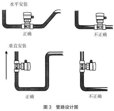 現(xiàn)場安裝時應(yīng)注意遠離可能對其產(chǎn)生干擾的大型設(shè)備,防止長期的熱輻射和其他如磁場直射等環(huán)境影響。為確保高測量精度和較好的零點穩(wěn)定性,進行校正前,高壓電磁流量計應(yīng)裝入工藝介質(zhì)中至少 24 小時電極鈍化。安裝的管路設(shè)計應(yīng)確保管道始終充滿流體,防止測量誤差,管路設(shè)計圖見圖 3。