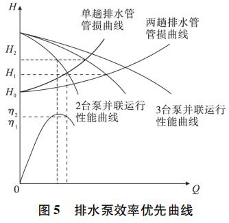 當(dāng)執(zhí)行多臺排水泵同時運(yùn)行時,通過排水泵特性曲線與管路特性曲線的比較,選擇非常好的匹配排水泵與排水管數(shù)量,保證排水泵在非常好的新效率點(diǎn)運(yùn)行。如圖 5 所示。