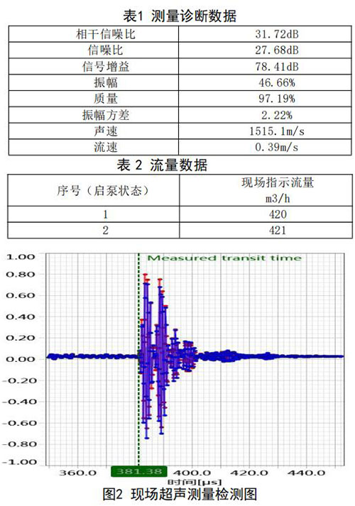 在高負(fù)荷段采用泵送補(bǔ)給水狀態(tài):測試時(shí)間 2018年10月11日,采用德國FLUEX高精度外夾式超 聲波流量計(jì)作為標(biāo)準(zhǔn)流量計(jì),測量基礎(chǔ)數(shù)據(jù):管道 外徑276.93mm,管壁厚度12.40mm,采用兩聲程169mm傳感器安裝距離,通過對(duì)超聲波流量計(jì)信號(hào) 分析與診斷(數(shù)據(jù)見表1、表2和圖2),診斷數(shù)據(jù) 提示標(biāo)準(zhǔn)超聲波流量計(jì)測量狀況佳,檢測開始,啟 動(dòng)補(bǔ)給水泵,運(yùn)行一段時(shí)間流量穩(wěn)定后,測量結(jié)果 如下: