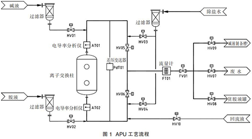 整個(gè) APU 都是通過 PLC 程序自動(dòng)控制的。程序通過控制閥門的開關(guān)使不同的液體按順序進(jìn)入離子交換柱,使離子交換柱中的液體按順序排出。