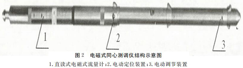 電磁式同心測調(diào)儀是同心分層注水工藝技術(shù)的關(guān)鍵儀器,其設計理念:集成流量測試與水量調(diào)節(jié)于一體,實現(xiàn)測調(diào)同 步;動力傳遞設計為同心降速機制,機械結(jié)構(gòu)簡單,動力傳遞效率高,測調(diào)穩(wěn)定性高。主要包括以下結(jié)構(gòu),如圖2所示。