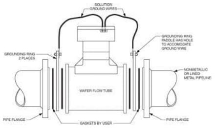 晶片式流量管:將晶片式流量管安裝在非金屬,塑料,PVC或帶襯里的工藝管道之間時(shí),需要接地環(huán)。必須通過將隨附的隨附的SG連接線連接到接地環(huán),將SG傳遞到流量管的主體/外殼上(圖6.)。