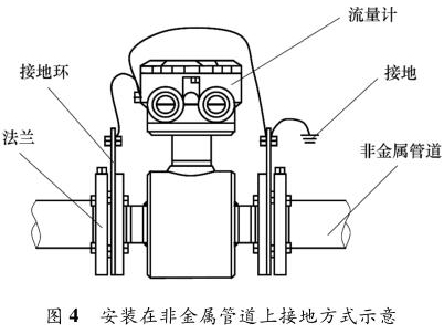 防腐型電磁流量計(jì)安裝在金屬管道上,安裝時(shí)將金屬管道與防腐型電磁流量計(jì)相連接,接地線(xiàn)再接入接地網(wǎng),如圖 3 所示。