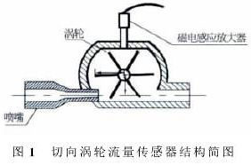 高溫導(dǎo)熱油流量計(jì)基本構(gòu)造見圖1。被測流體在流經(jīng)葉輪之前流道會(huì)減縮,流速增加,流體經(jīng)過葉輪后葉片旋轉(zhuǎn),磁電傳感器記錄葉片轉(zhuǎn)動(dòng)頻率,得到被測流體相對(duì)應(yīng)的流量。