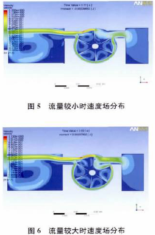 (1)數(shù)值仿真結(jié)果與物理實(shí)驗(yàn)結(jié)果基本一致,當(dāng)流速低于啟動(dòng)排量,渦輪未啟動(dòng)時(shí),流體沿葉片做繞角運(yùn)動(dòng),葉片兩側(cè)壓力相等,葉片不轉(zhuǎn)動(dòng);當(dāng)流速高于啟動(dòng)排量,渦輪轉(zhuǎn)動(dòng)時(shí),流體在腔內(nèi)產(chǎn)生旋渦,造成葉片兩邊壓差,從而造成葉片轉(zhuǎn)動(dòng)。