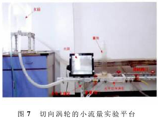 為了驗(yàn)證仿真的準(zhǔn)確性,通過室內(nèi)實(shí)驗(yàn)對(duì)其驗(yàn)證。切向渦輪采用可視化研究平臺(tái),整個(gè)渦輪的結(jié)構(gòu)都采用亞克力板雕刻組裝而成。如圖7所示,水箱主要提供穩(wěn)定水壓,水平切向渦輪做成開口系統(tǒng)并放置在實(shí)驗(yàn)支撐架上,前置閥門可控制水流,在需要更換切向渦輪的零件時(shí)可關(guān)閉,控制閥門主要是控制流經(jīng)切向渦輪的流量,流量測量仍采用傳統(tǒng)可靠的容積時(shí)間法。實(shí)驗(yàn)時(shí)以染色劑作為示蹤劑,以觀察流場的分布情況。