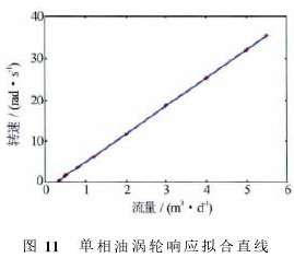 采用同樣的方法,對(duì)單相油條件下渦輪響應(yīng)規(guī)律進(jìn)行研究(見圖11),測得單相油的啟動(dòng)排量為0.08m3/d。對(duì)單相油的實(shí)驗(yàn)結(jié)果進(jìn)行擬合,可得單相油的響應(yīng)曲線為ω=6.73Q-6.72。與水對(duì)比而言,油的擬合曲線斜率更大,即隨著流量增加轉(zhuǎn)速增加得略快。