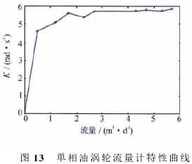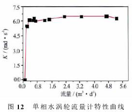 可以看出,渦輪啟動(dòng)后*先進(jìn)入一個(gè)非線性段,在非線性相應(yīng)段,K值隨著流量增加而增大;當(dāng)流量比較大(單相水超過0.5m3/d,單相油超過1m3/d)時(shí),渦輪進(jìn)入線性段,在線性響應(yīng)段,K值達(dá)到峰值,有相對(duì)較小的波動(dòng)。