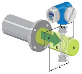 管道式電磁流量計(jì)使用法拉*電磁感應(yīng)定律進(jìn)行流量測量。法拉*定律指出,每當(dāng)長度為“ l”的導(dǎo)體以垂直于磁場“B”的速度“v”運(yùn)動時(shí),就會在相互垂直的方向上感應(yīng)出電動勢“e”,其方向?yàn)?br /> e = Blv……(eq1)