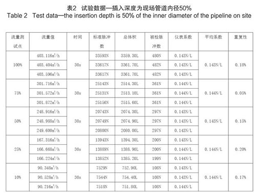 氣體渦輪流量計插入深度為現(xiàn)場管道內(nèi)徑的50%時,試驗(yàn)數(shù)據(jù)如下(以 DN200 為例):