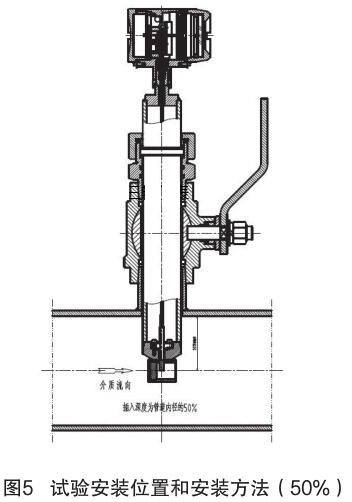 對(duì)插入式渦街流量計(jì)和插入式電磁流量計(jì)的結(jié)構(gòu)原理進(jìn)行分析,插入式電磁流量計(jì)的信號(hào)采集點(diǎn)在標(biāo)校管道內(nèi)12.5% 為宜,因它屬電磁類(lèi)流量計(jì),而流量計(jì)是根據(jù)“卡門(mén)渦街”原理進(jìn)行測(cè)量管道內(nèi)流量,根據(jù)標(biāo)校管道內(nèi)層流和湍流的分析,以及流量計(jì)獨(dú)特的探頭結(jié)構(gòu)形式,確定煙氣流量計(jì)的插入深度為標(biāo)校管道內(nèi) 50%,試驗(yàn)安裝位置和安裝方法如圖 5 所示。
