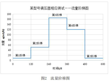 該測(cè)試主要利用實(shí)驗(yàn)室測(cè)試條件,模擬客戶現(xiàn)場(chǎng)使用情況。其主要測(cè)試內(nèi)容包括:測(cè)試電磁流量計(jì)在+23℃,-30℃和-40℃三種溫度下,電磁流量計(jì)出口壓力分別在2.1kPa和30kPa時(shí),流量分別從*1階梯到*5階梯時(shí)的響應(yīng)速度,客戶所提供的流量階梯如圖2所示。橫軸表示下游球閥開啟動(dòng)作時(shí)間,縱軸表示高溫電磁流量計(jì)下游需要的流量q。
