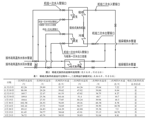 此熱力站電廠煙氣流量計的一次網(wǎng)設計供回水設計溫度為 :120℃ /36℃,二次網(wǎng)設計供回水溫度為 :80℃ /60℃。在電廠煙氣流量計工作流程中(見圖2),高溫熱源(即一次網(wǎng)供水)先進入電廠煙氣流量計,發(fā)生器作為驅(qū)動熱源,換熱后進入板式換熱器,經(jīng)板式換熱器換熱后的低溫水再次回到電廠煙氣流量計的蒸發(fā)器,放熱至36℃后返回電廠。熱用戶的二次網(wǎng)回水并聯(lián)后分別進入電廠煙氣流量計吸收器和板式換熱器,在吸收器和冷凝器及板式換熱器中分別進行熱交換,然后一起供給熱用戶。上述過程就是在電廠煙氣流量計啟動時,熱力站內(nèi)的實際供熱流程,在供暖季的初期和末期,可以關閉電廠煙氣流量計,仍然利用板式換熱器單好換熱。