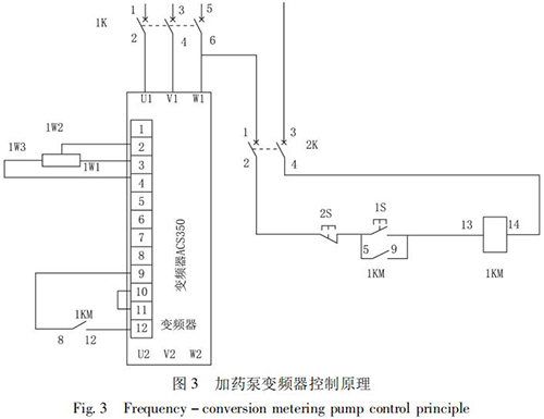 STD - Ⅲ型浮選工藝參數(shù)自動(dòng)測控系統(tǒng)通過雙膜盒差壓計(jì)測量原礦漿濃度; 采用工業(yè)水流量計(jì)測量原礦漿流量,由 PLC 計(jì)算出入浮干煤泥量和藥劑的瞬時(shí)添加量,用變頻式計(jì)量泵完成浮選藥劑的添加。通過上位機(jī)還可以打印小時(shí)、班、天及月的運(yùn)行數(shù)據(jù),更加有利于生產(chǎn)管理及技術(shù)分析,藥劑自動(dòng)原理如圖 2 所示,k1、k2、k3 是計(jì)算修正參數(shù)。以 PID 算法為核心,通過優(yōu)化控制程序計(jì)算出藥劑給定量,在捕收劑和起泡劑管道上分別安裝藥劑測量裝置,用于檢測藥劑的添加量。當(dāng)藥劑測量值小于藥劑給定量時(shí),PID 輸出增大,反之則減小。加藥泵變頻器控制原理如圖 3 所示。