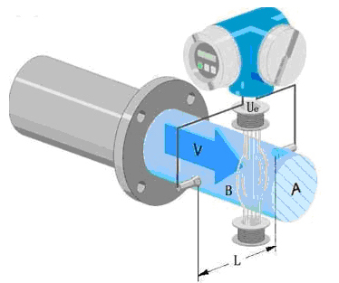 污水流量表工作原理是基于法拉*電磁感應(yīng)定律。流量計(jì)的測(cè)量管是一內(nèi)襯絕緣材料的非導(dǎo)磁合金短管。兩只電極延管徑方向穿通管壁固定在測(cè)量管上。其電極頭與襯里內(nèi)表面基本齊平。勵(lì)磁線(xiàn)圈由雙向方波脈沖勵(lì)磁時(shí),將在與測(cè)量管軸線(xiàn)垂直的方向上產(chǎn)生一磁通量密度為 B 的工作磁場(chǎng)。此時(shí),如果具有一定電導(dǎo)率的流體流經(jīng)測(cè)量管,將切割磁力線(xiàn)感應(yīng)出電動(dòng)勢(shì) E 。電動(dòng)勢(shì) E 正比于磁通量密度 B ,測(cè)量管內(nèi)徑 d 與平均流速 v 的乘積。電動(dòng)勢(shì) E (流量信號(hào))由電極檢出并通過(guò)電纜送至轉(zhuǎn)換器。轉(zhuǎn)換器將流量信號(hào)放大處理后,可顯示流體流量,并能輸出脈沖,模擬電流等信號(hào),用于流量的控制和調(diào)節(jié)。