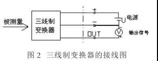三線制變換器的接線圖如圖 2 所示,電流輸出系統(tǒng)除了兩根電流傳輸線以外,還有一根電源線向變壓器提供電源。三線制就是電源正端用一根線,信號輸出正端用一根線,電源負(fù)端和信號負(fù)端共用一根線。其供電大多為 DC 24V , 輸出信號有 DC4-20mA ,負(fù)載電阻為 250Ω 或者 DC0-10mA ,負(fù)載電阻為 0-1.5kΩ ;有的還有 mA 和 mV 信號,但負(fù)載電阻或輸入電阻,因輸出電路形式不同而數(shù)值有所不同。