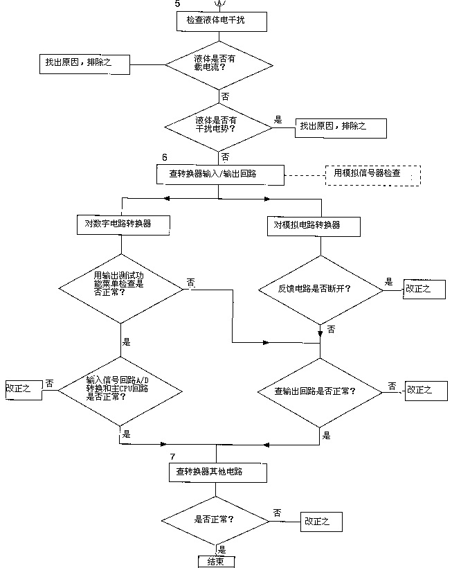 先在管系和流量傳感器內(nèi)通水,靜止無(wú)流動(dòng)狀態(tài)下將轉(zhuǎn)換器兩信號(hào)端子和功能地或保護(hù)地端子短路,觀察轉(zhuǎn)換器輸出信號(hào)足否到零。若能到零,則可初步判斷故障在轉(zhuǎn)換之前而不在轉(zhuǎn)換器本身及后位儀表,下一步可先重點(diǎn)檢查連接電纜和傳感器(即流程圖*2項(xiàng));若不能到零,則檢查重心應(yīng)在轉(zhuǎn)換器和后位儀表(即流程圖*3、4、6、7項(xiàng))。